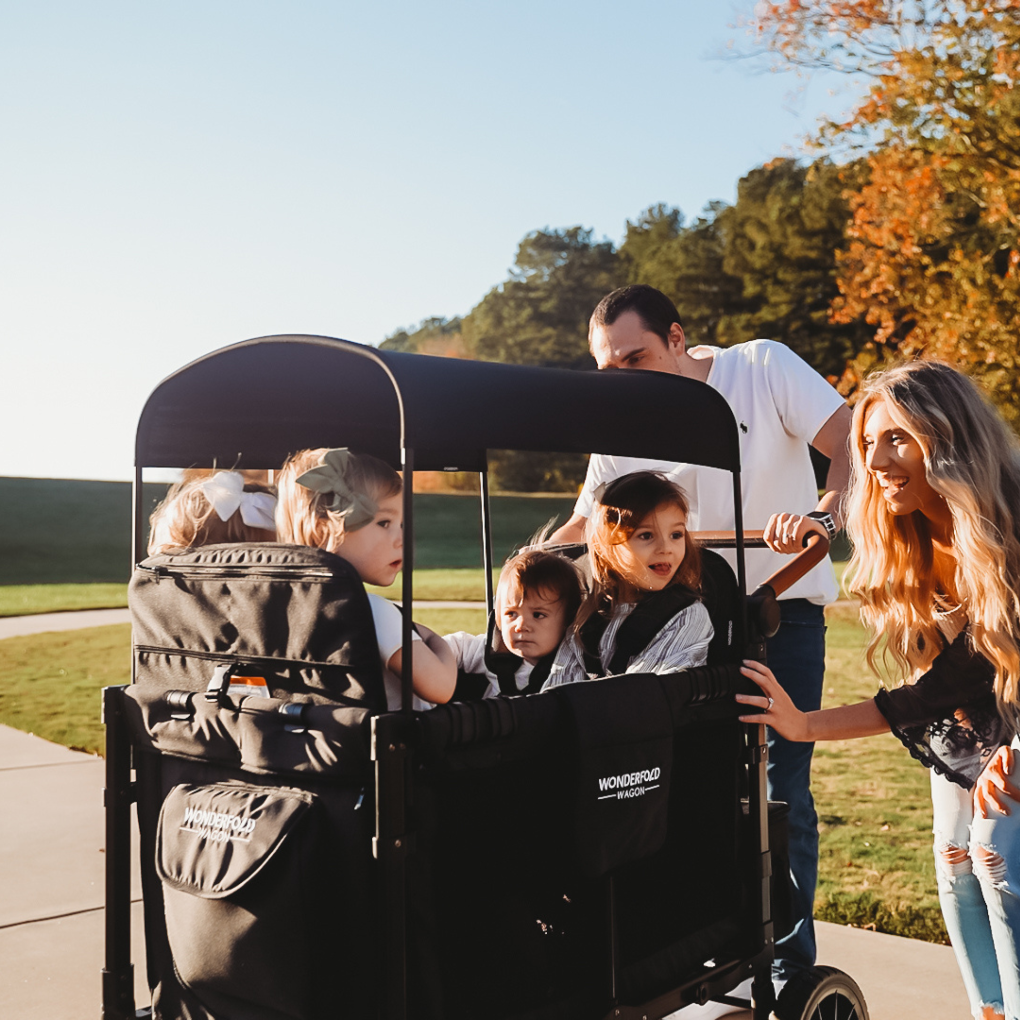 The WonderFold W4 Luxe Stroller Wagon Volcanic Black seats up to 4 children, folds easily and has all terrain wheels, making your big day out a much easier adventure.